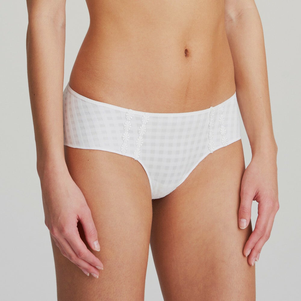 Hotpants hebben vooraan een elegante beenuitsnijding zoals de rioslip en komen achteraan halverwege de bips. Ze zitten laag in de taille. Volledig blikdicht met twee rijen Avero-bloemetjes vooraan. Wit is puur, fris en altijd vrolijk! In Wit zijn de madeliefjes en ruitjes ton-sur-ton.